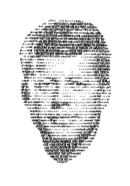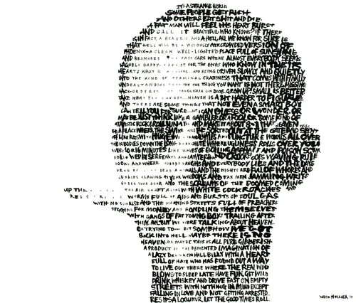 Mastering free-form, hand-drawn calligraphy, using brush strokes to visually depict a picture is central to Hollier's working method. Stylistically, Imago Verbosa (meaning an image made of words) happens on the surface, in the contrast, between dark and light. Each character is individually hand-painted using acrylics on board and canvas, or a vintage typewriter.